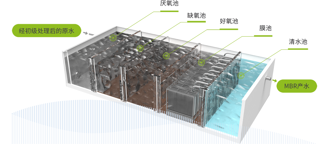 傳統MBR技術具有産水水質優和占地面(miàn)積省等特點,被(bèi)廣泛應用于污水處理系統的三級處理工藝。與此同時(shí),傳統MBR技術在應用過(guò)程中普遍存在著(zhe)運行能(néng)耗高和清洗頻率高等共性問題。基于上述問題,美能(néng)環保對(duì)傳統MBR技術進(jìn)行了系統、全面(miàn)的改良設計,針對(duì)性地開(kāi)發(fā)了改良MBR技術,旨在顯著提升了MBR技術的運行效率和抗污染能(néng)力。