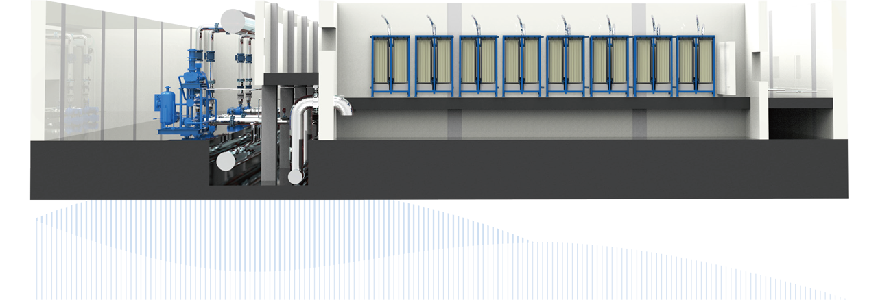壓力式超濾之外的另一種(zhǒng)超濾應用形式,與壓力式超濾具有相同的應用效果,以負壓或重力爲驅動力,具有運行成(chéng)本低、對(duì)進(jìn)水水質要求低等優點。基于超濾技術優異的機械分離能(néng)力,其廣泛應用于大規模的市政、工業等領域的原水處理或污水資源化、自來水處理、反滲透系統進(jìn)水預處理等。